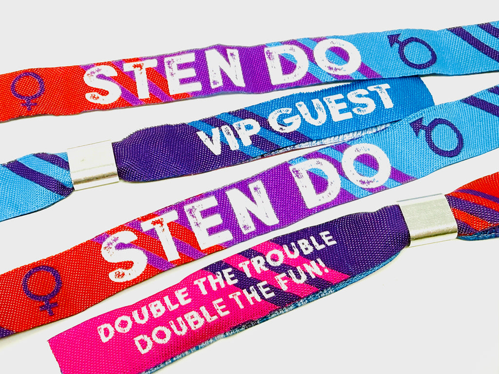 The wristbands feature the text STEN DO on the main part of the wristband with the words VIP GUEST and DOUBLE THE TROUBLE / DOUBLE THE FUN on either side of the tails. the hen party wristbands feature a super cool design featuring a mix of blues, purples, pinks and white so they can be worn by any sex.