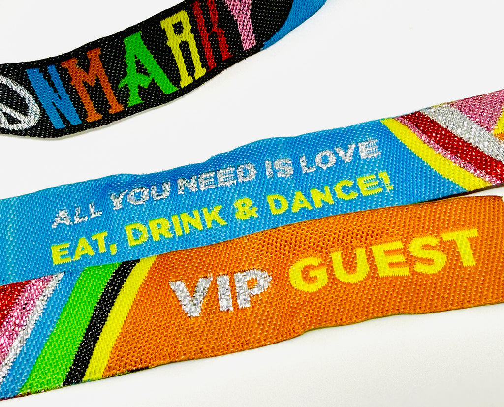 These generic colourful embroidered wristbands are designed to give guests the authentic festival experience, just like a real event wristband – making them ideal for festival weddings, tipi weddings, camping weddings, farm weddings and wedding weekends.